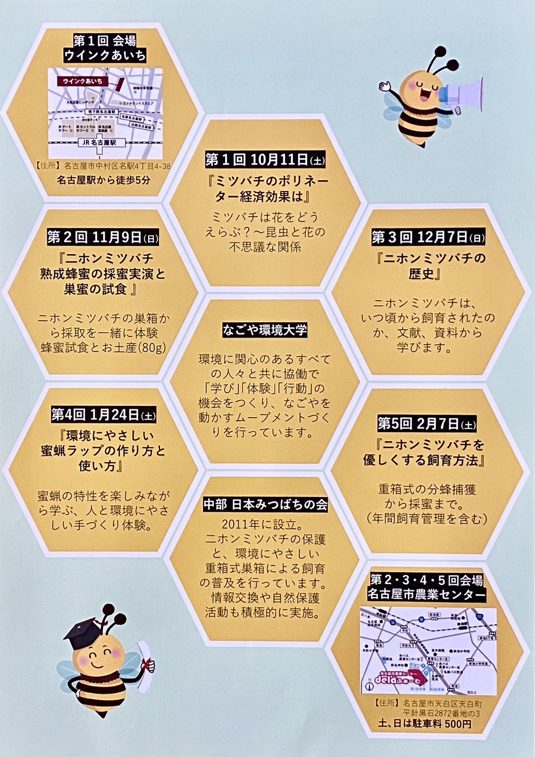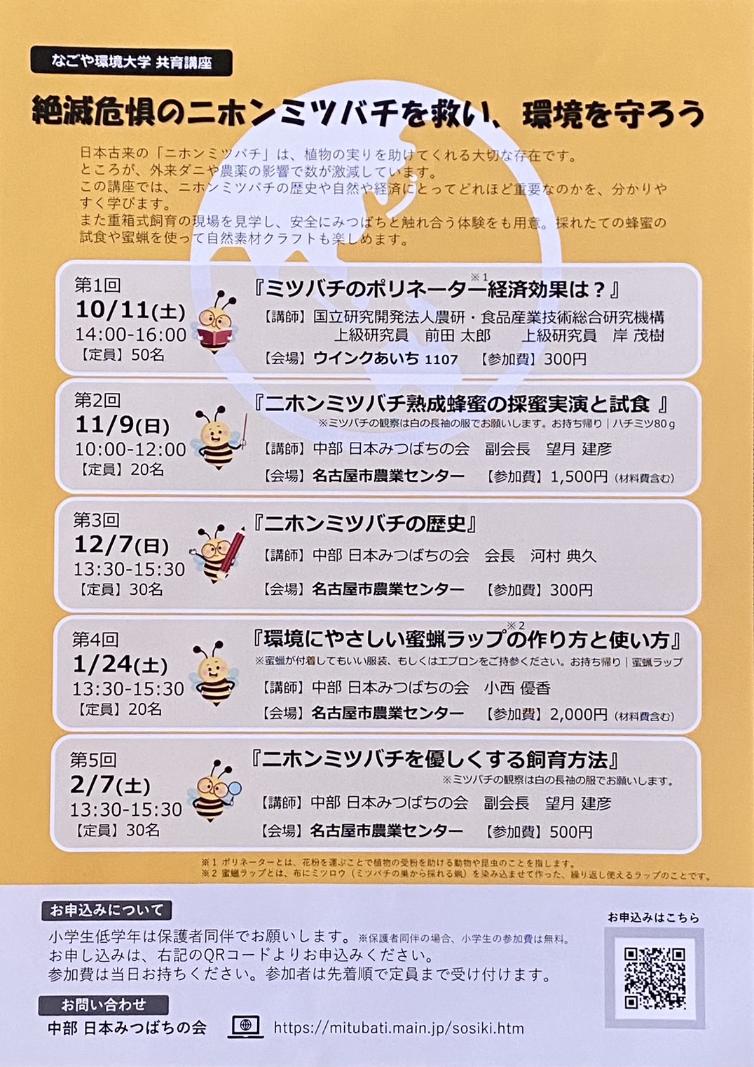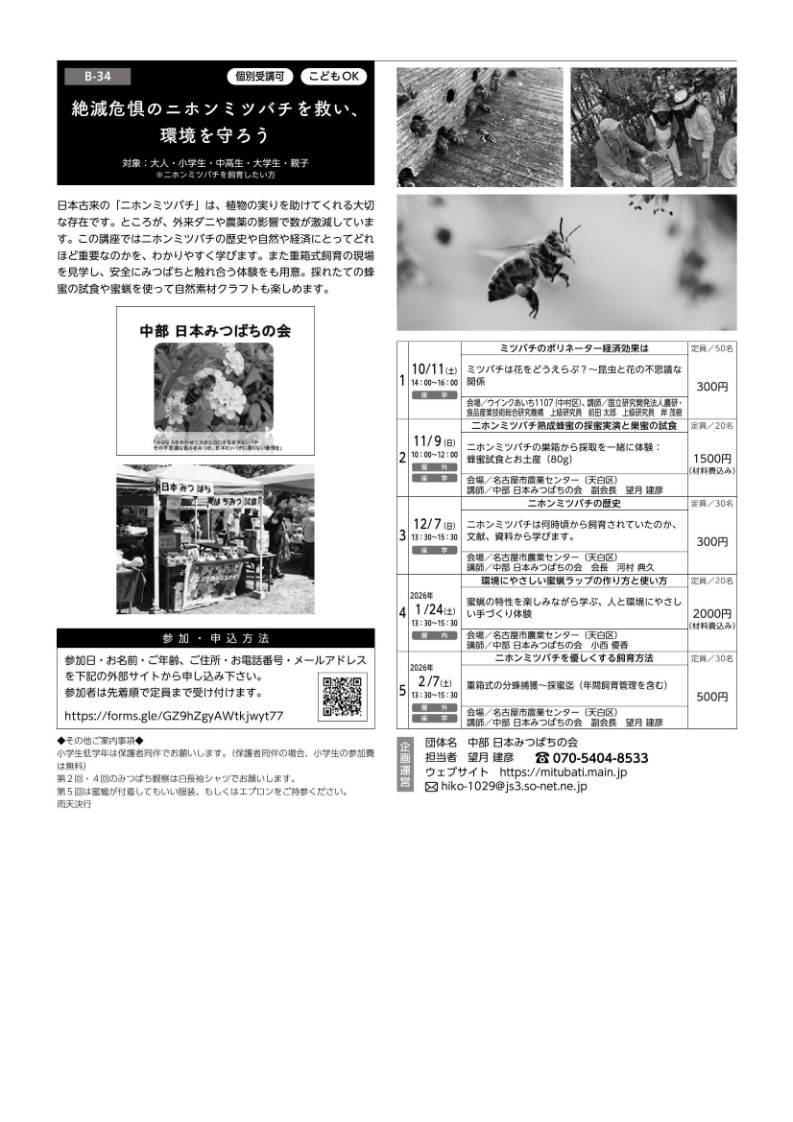 中部 日本みつばちの会は今回なごや環境大学(市民講座)に参加しニホンミツバチ講座を開催します。 内容「絶滅危惧のニホンミツバチを救い環境を守ろう!!」 この講座はミツバチの歴史・経済効果・生態・重箱式飼育方法をわかりやすく学べます。 ニホンミツバチ飼育にご興味のある方は是非ご参加ください。
